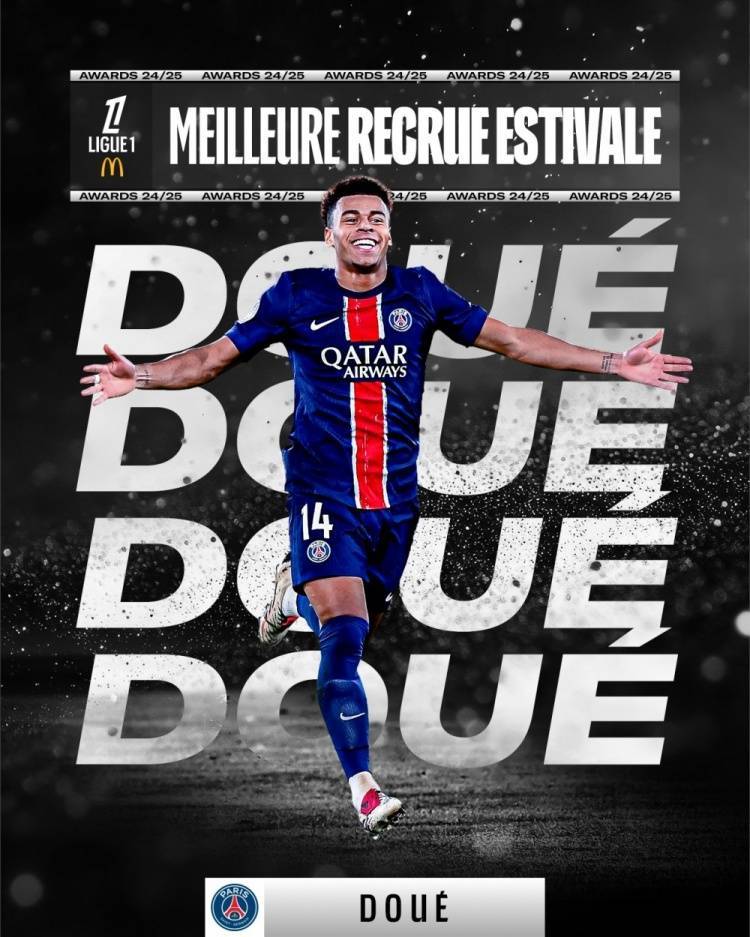 直播吧6月10日讯 据法甲联赛官方消息,巴黎圣日耳曼从雷恩引进的杜埃被评为2024-2025赛季的法甲最佳引援。在上个夏季转会窗口,巴黎花费了5000万欧元从雷恩签下杜埃。